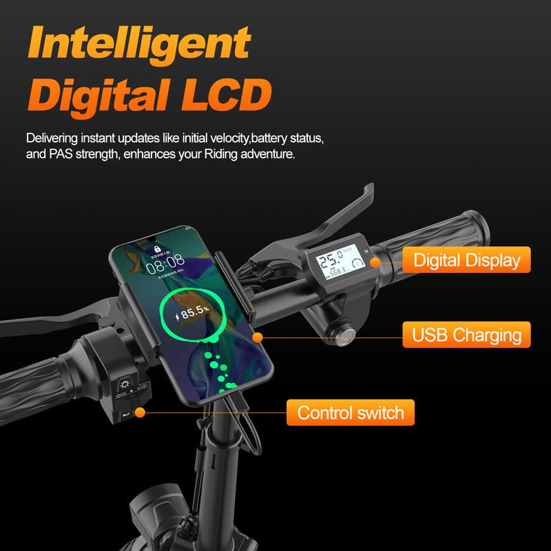 • Foldable & Convenient Design: The 14" folding mini bike design makes it an ideal choice for urban commuters and those with limited storage space. There are 3 speed gears, allowing you to easily click "M" next to the LCD display to set and choose your preferred speed. Alternatively, you can directly use the twist throttle to accelerate.
