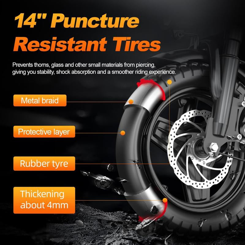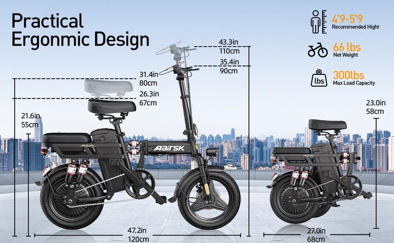 • Electric Mini Bike & 14x2.12 Tires: Suitable for riders ranging from 5.0 to 5.9 feet, this bike features a maximum load capacity of 330 pounds and weighs only 66 pounds. The 14" x 2.12" fat tires are anti-slip and puncture-proof, ensuring you can ride like roads, snow, beaches, and trails.