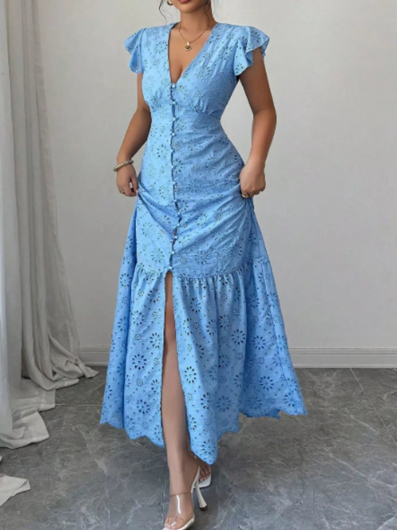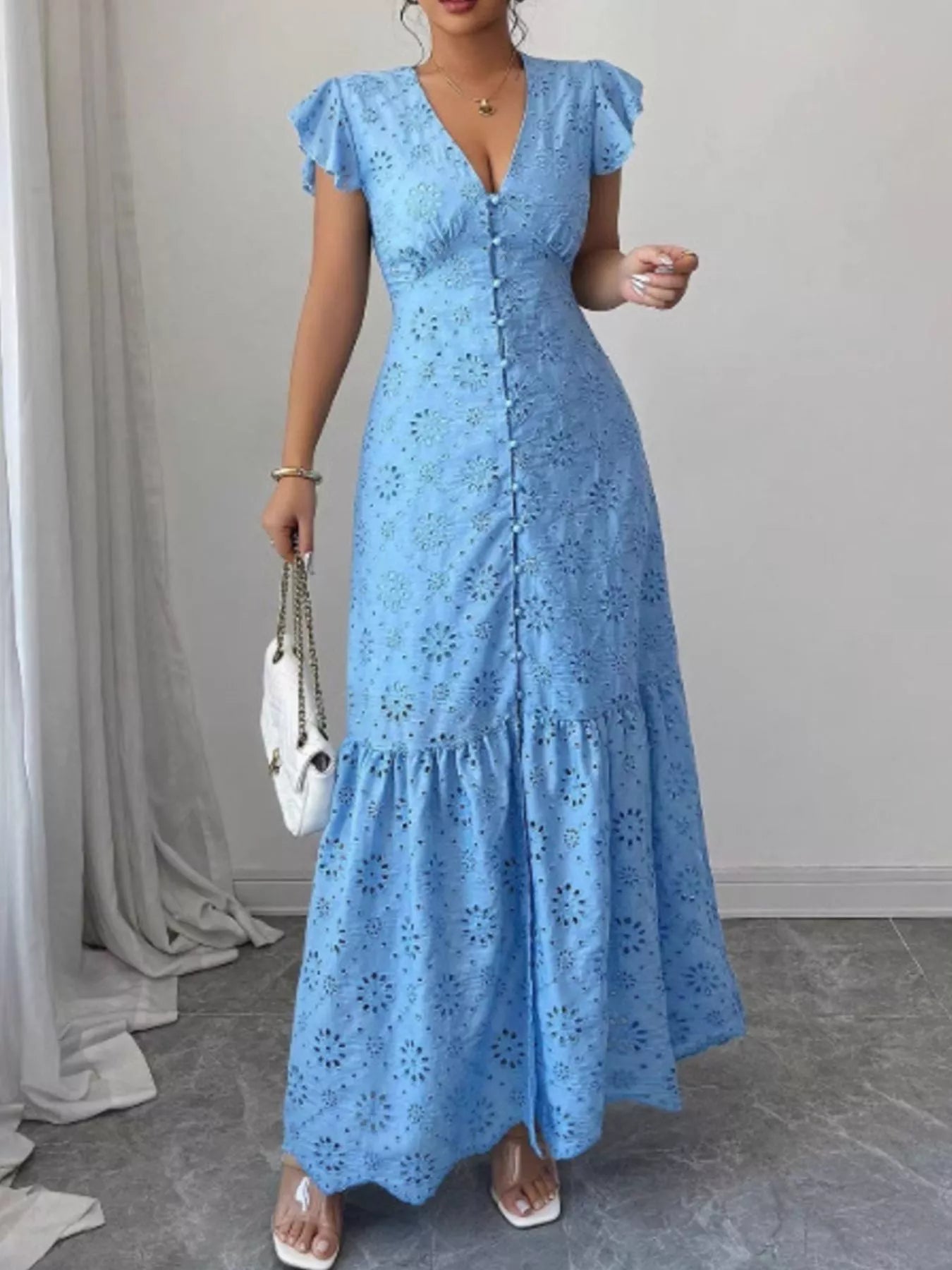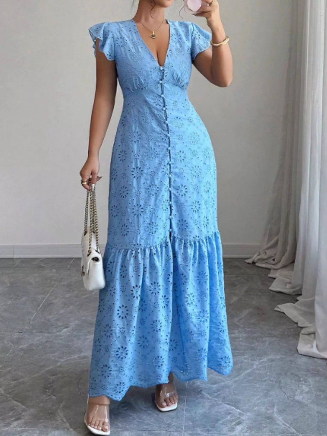 Floral Eyelet Ruffled Cap Sleeve Maxi Dress