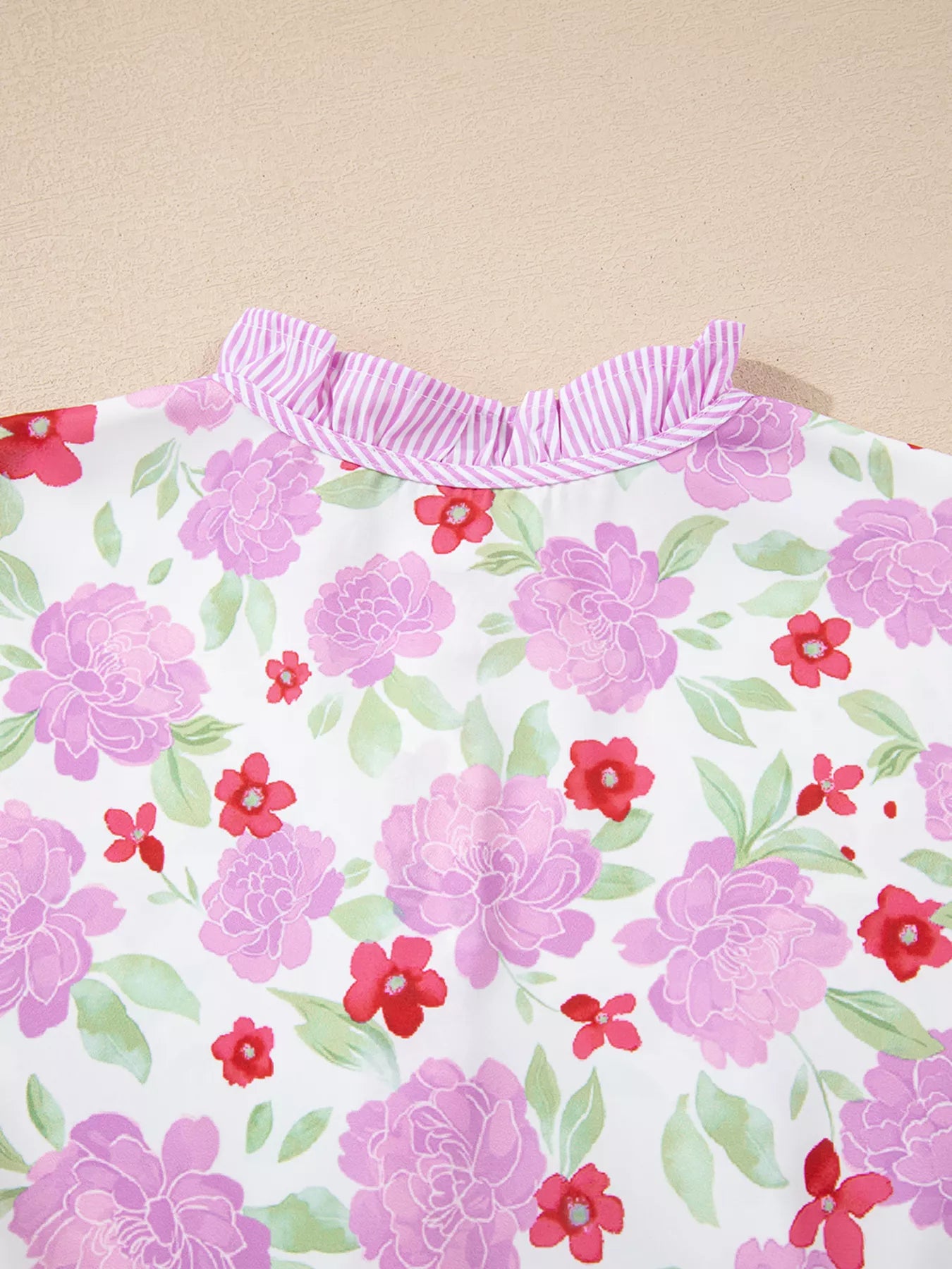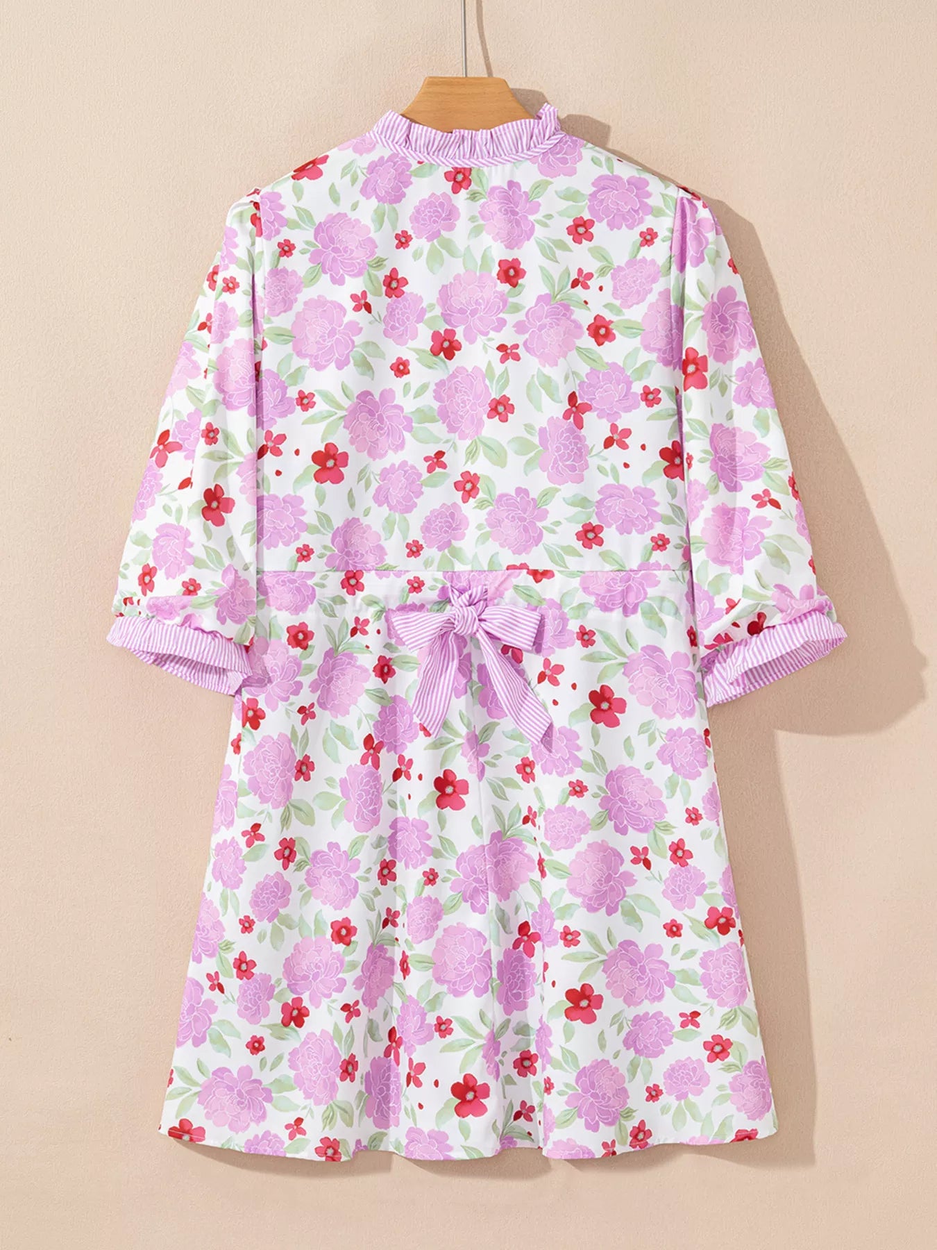 Floral Print Striped Trim Frilled Neck 3/4 Sleeve Flared Mini Dress