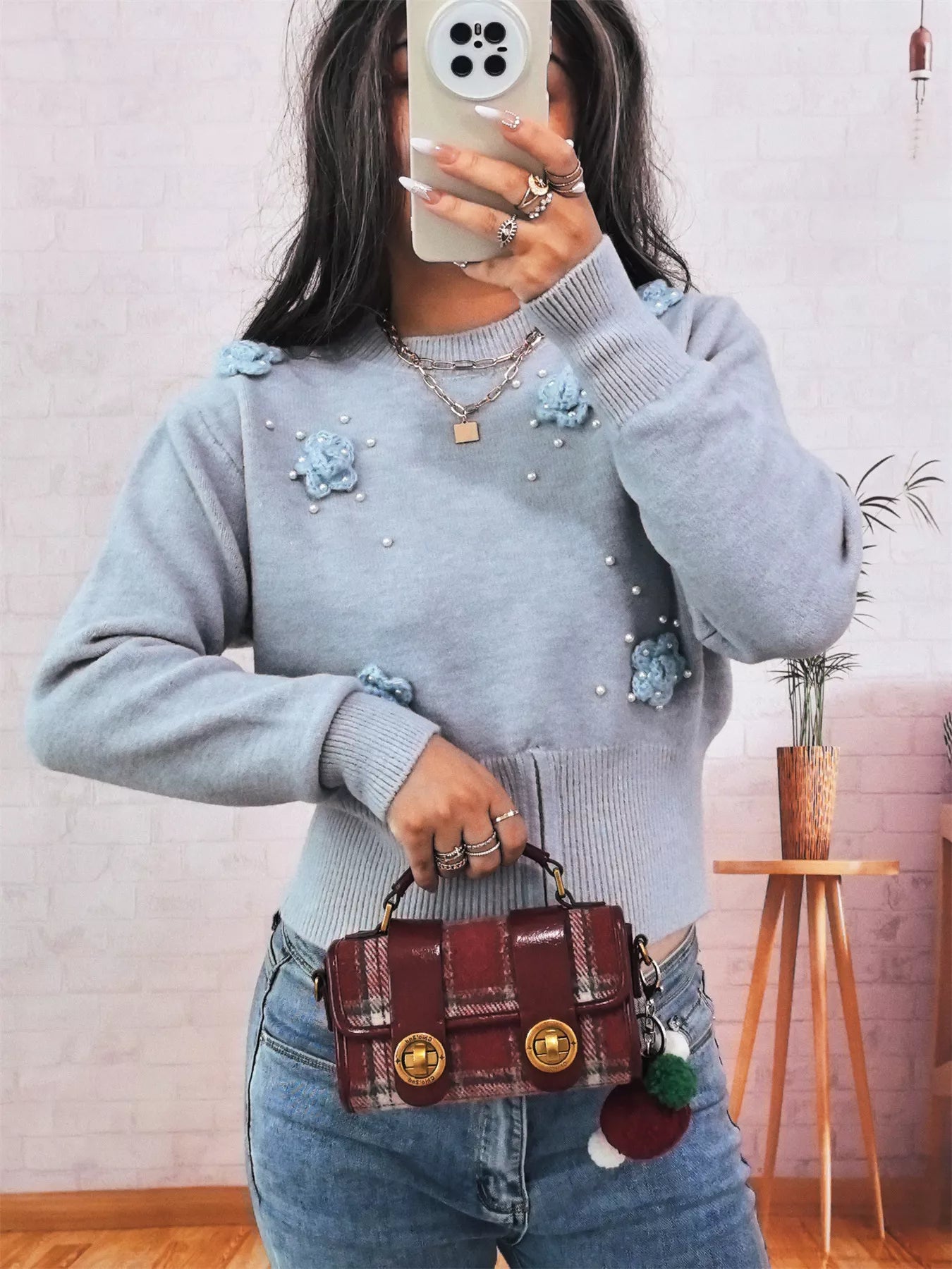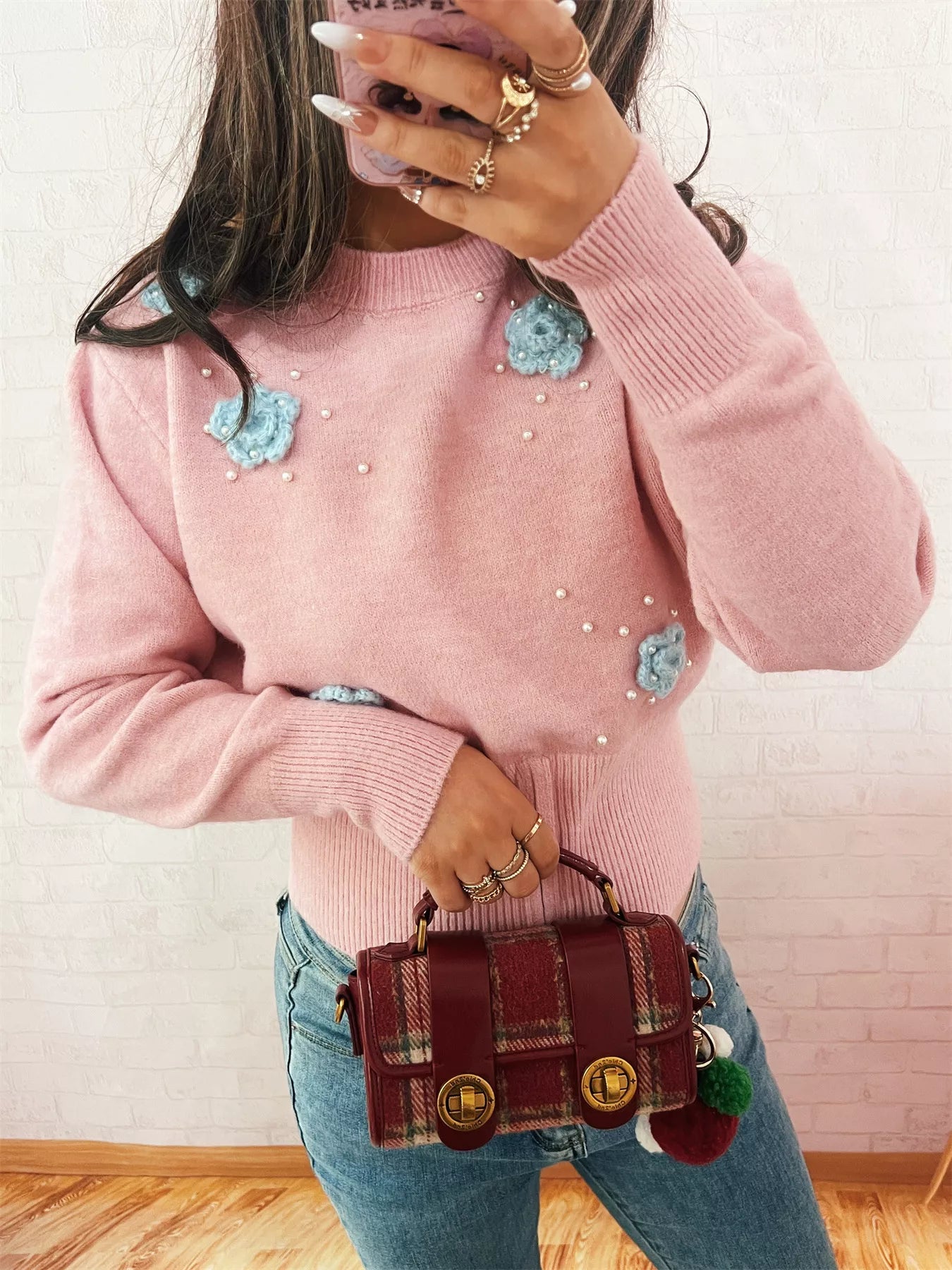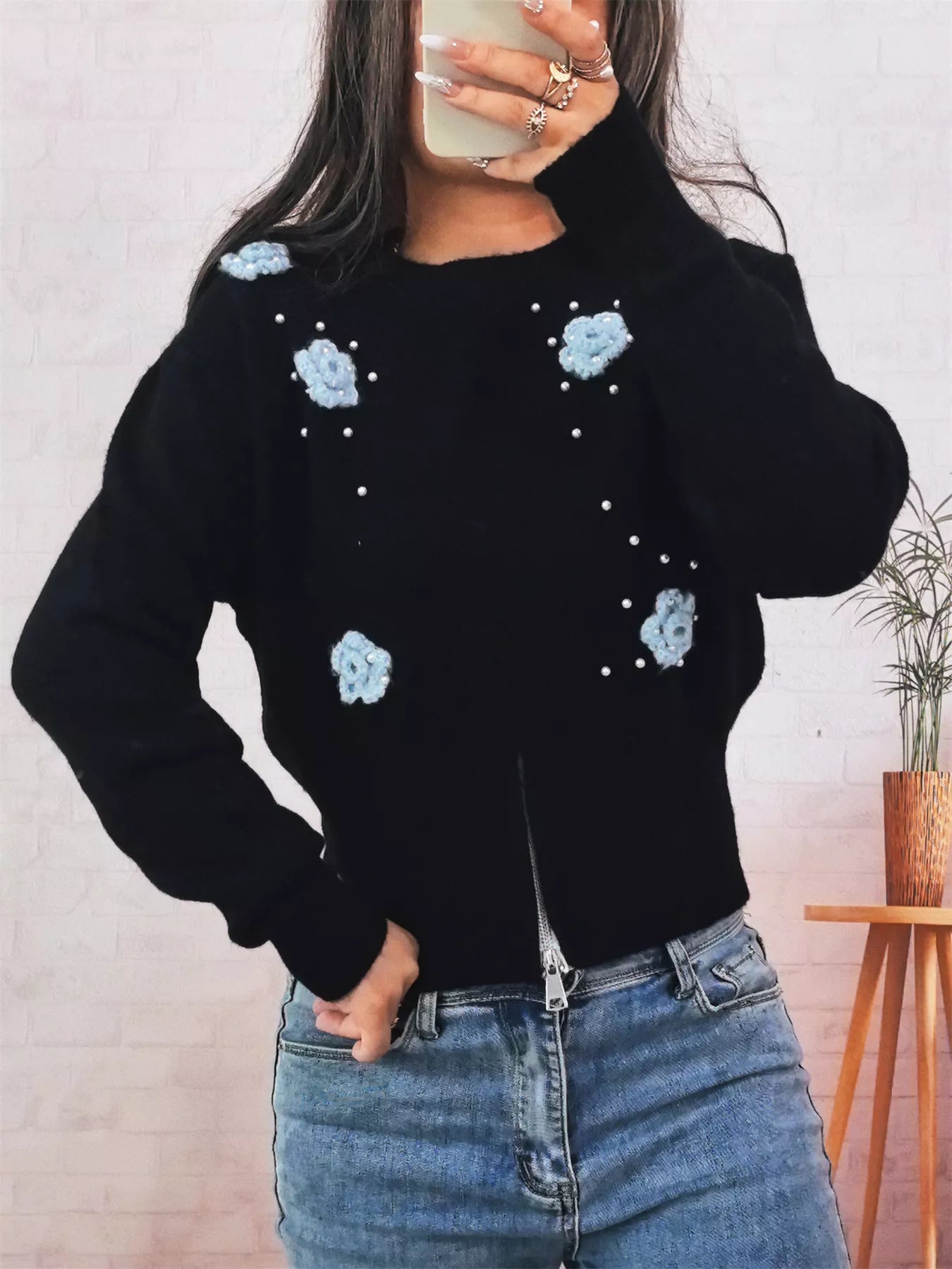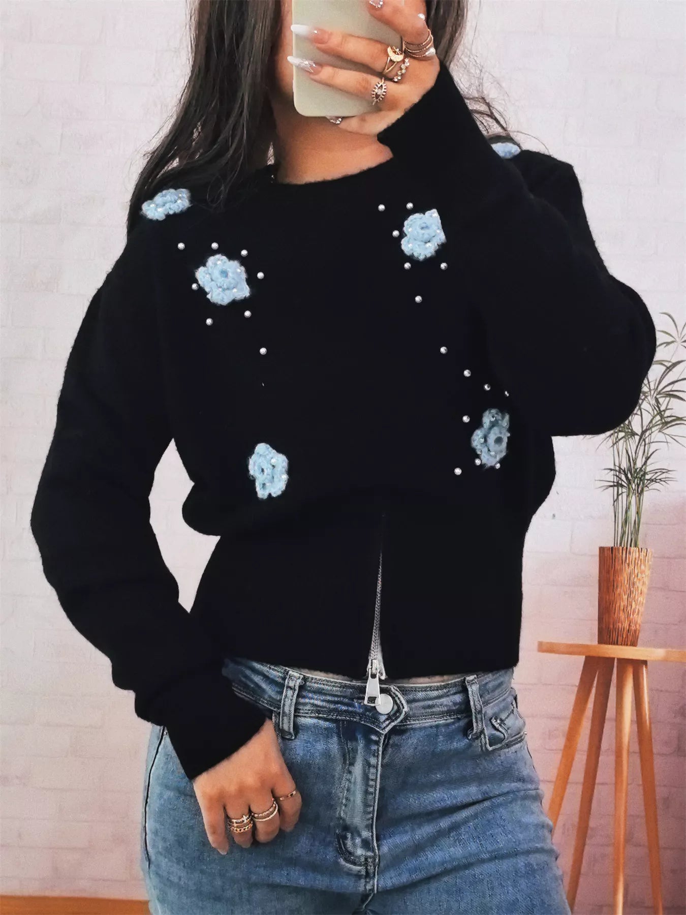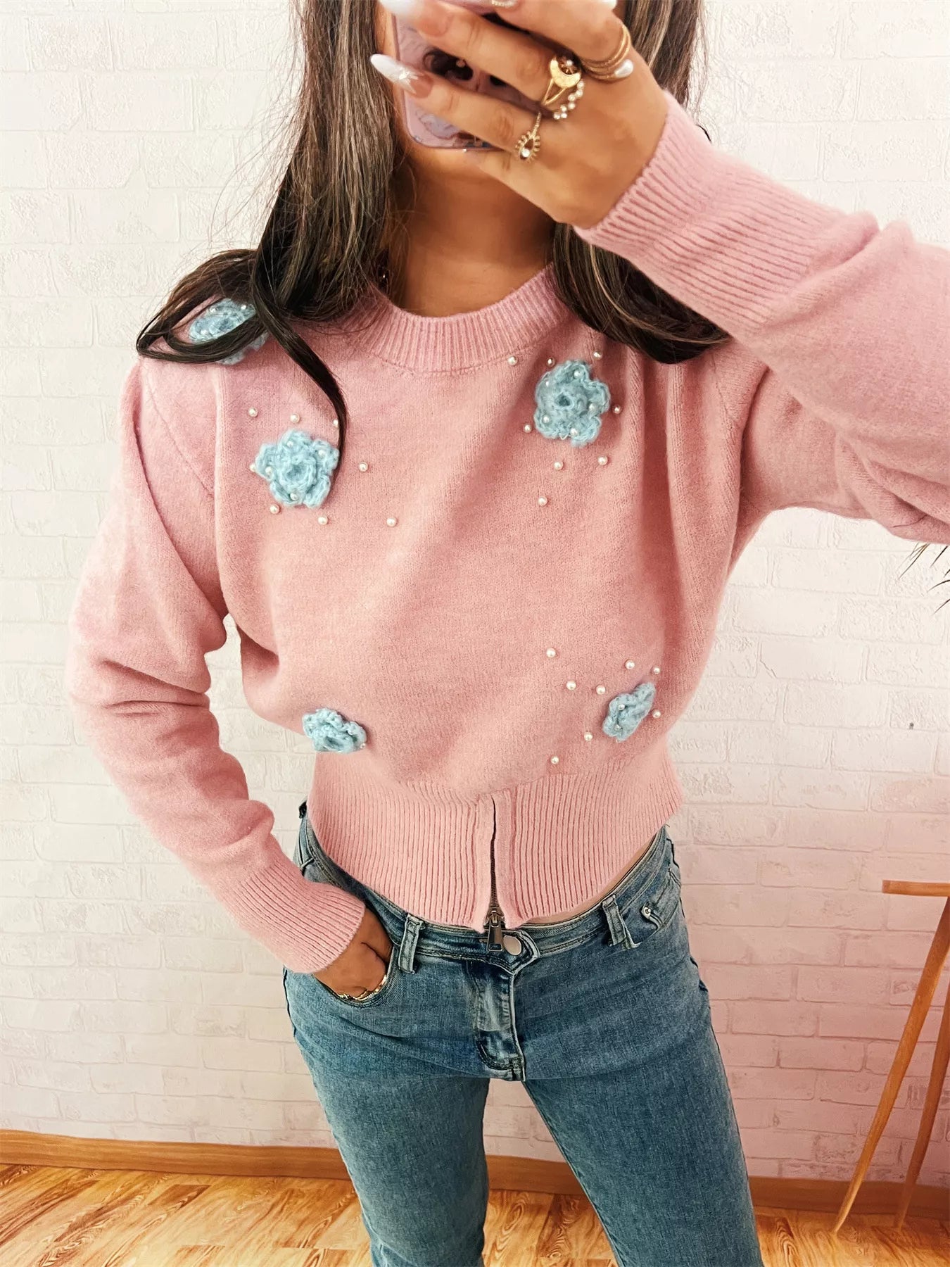 Flower Pearl Detail Ribbed Hem Sweater