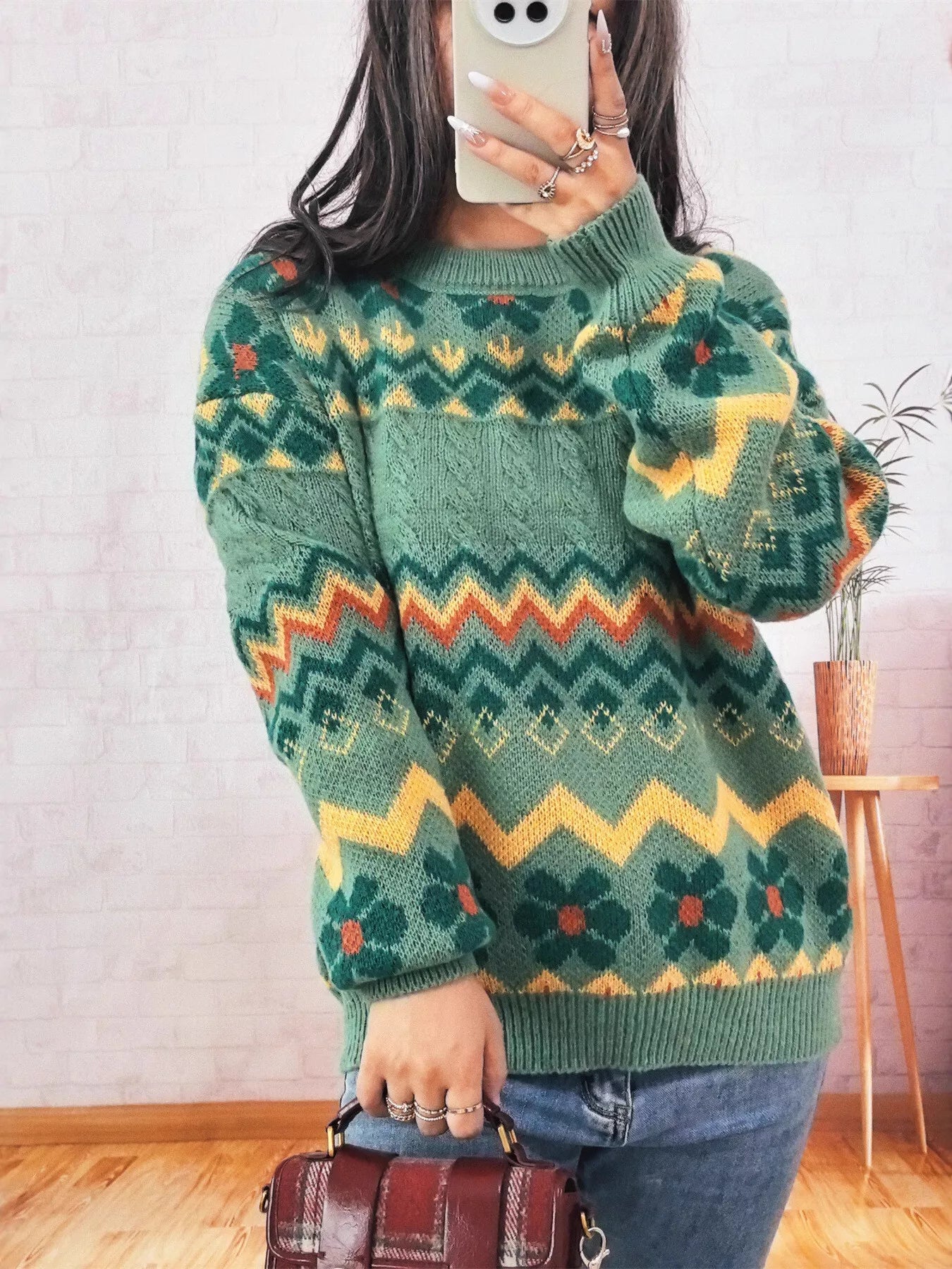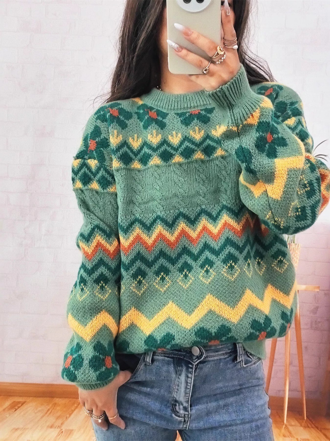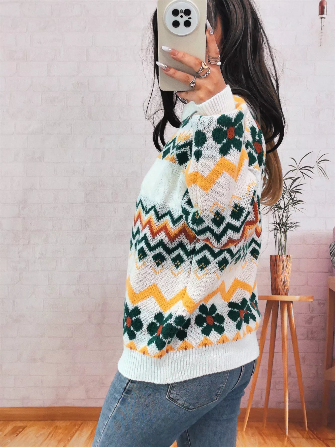 Geometric Round Neck Long Sleeve Sweater