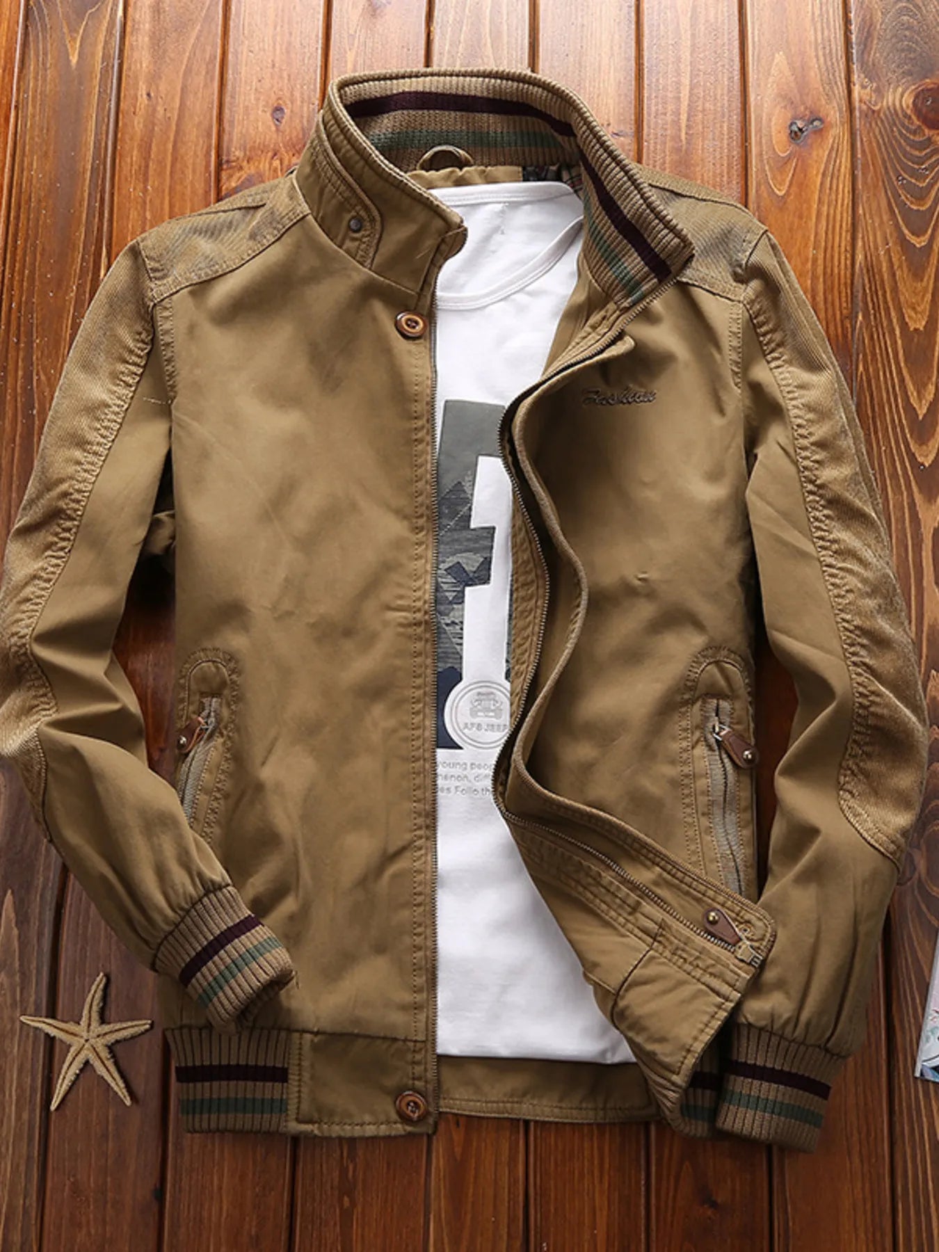 Men's Full Size Bomber Jacket with Ribbed Cuffs and Collar Plus Size