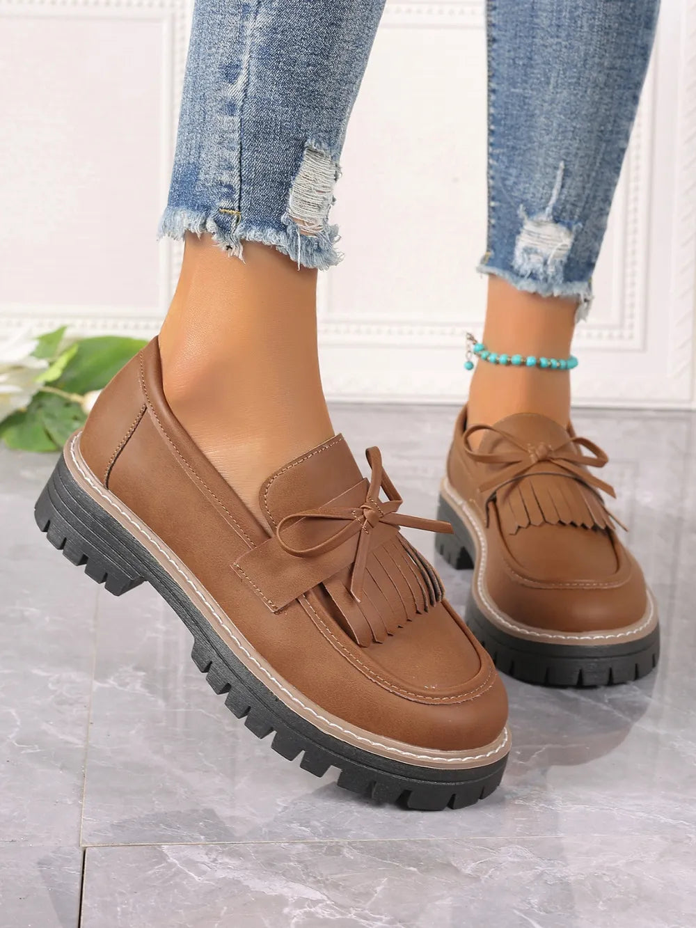 PU Leather Bow Platform Loafers