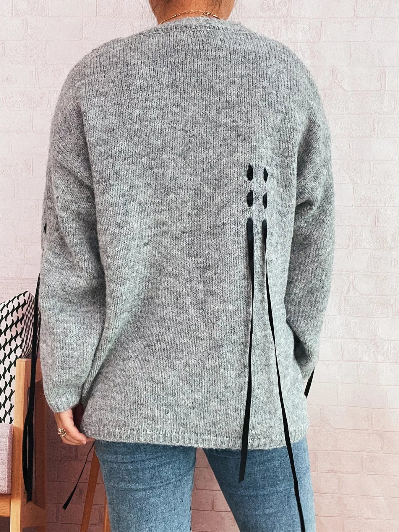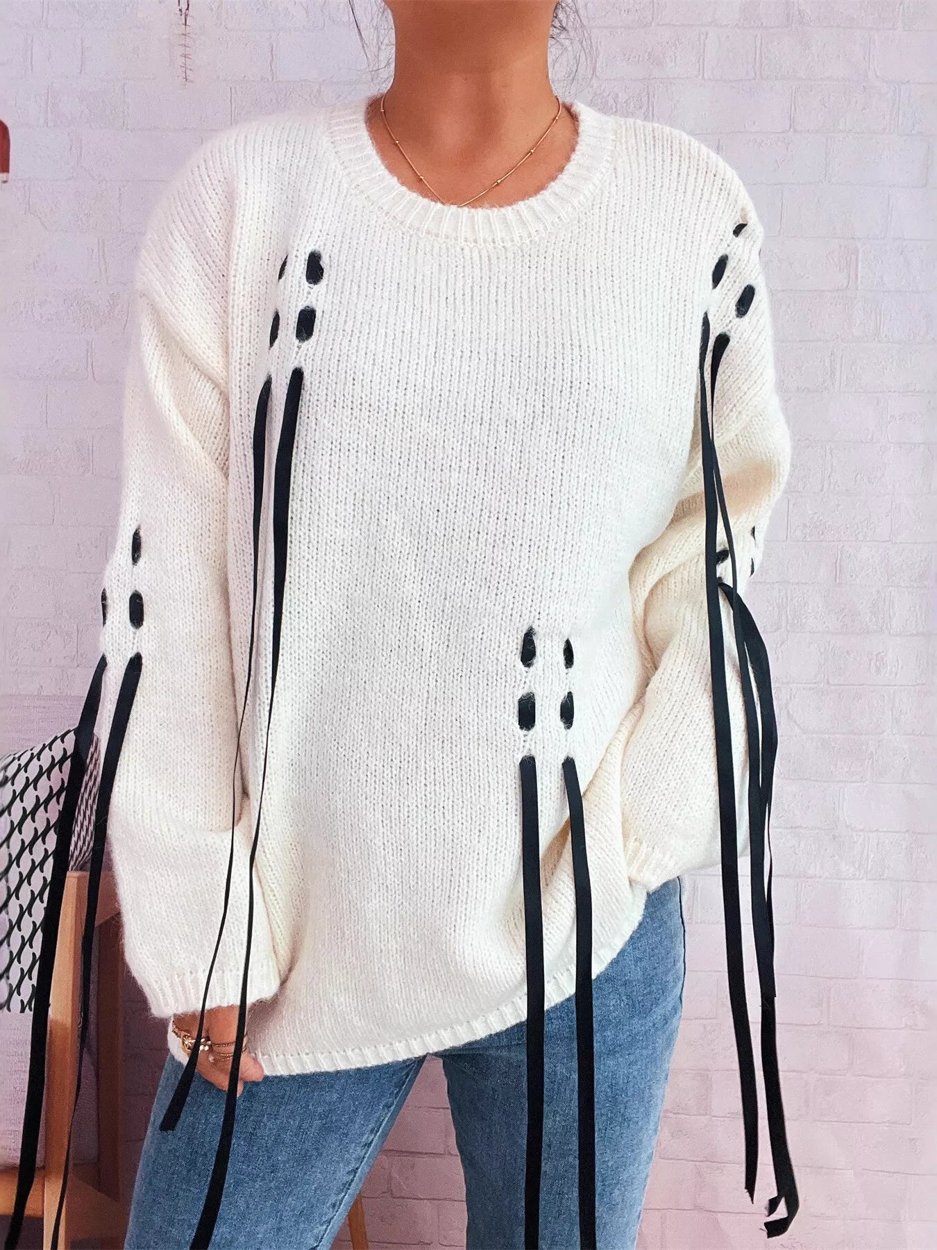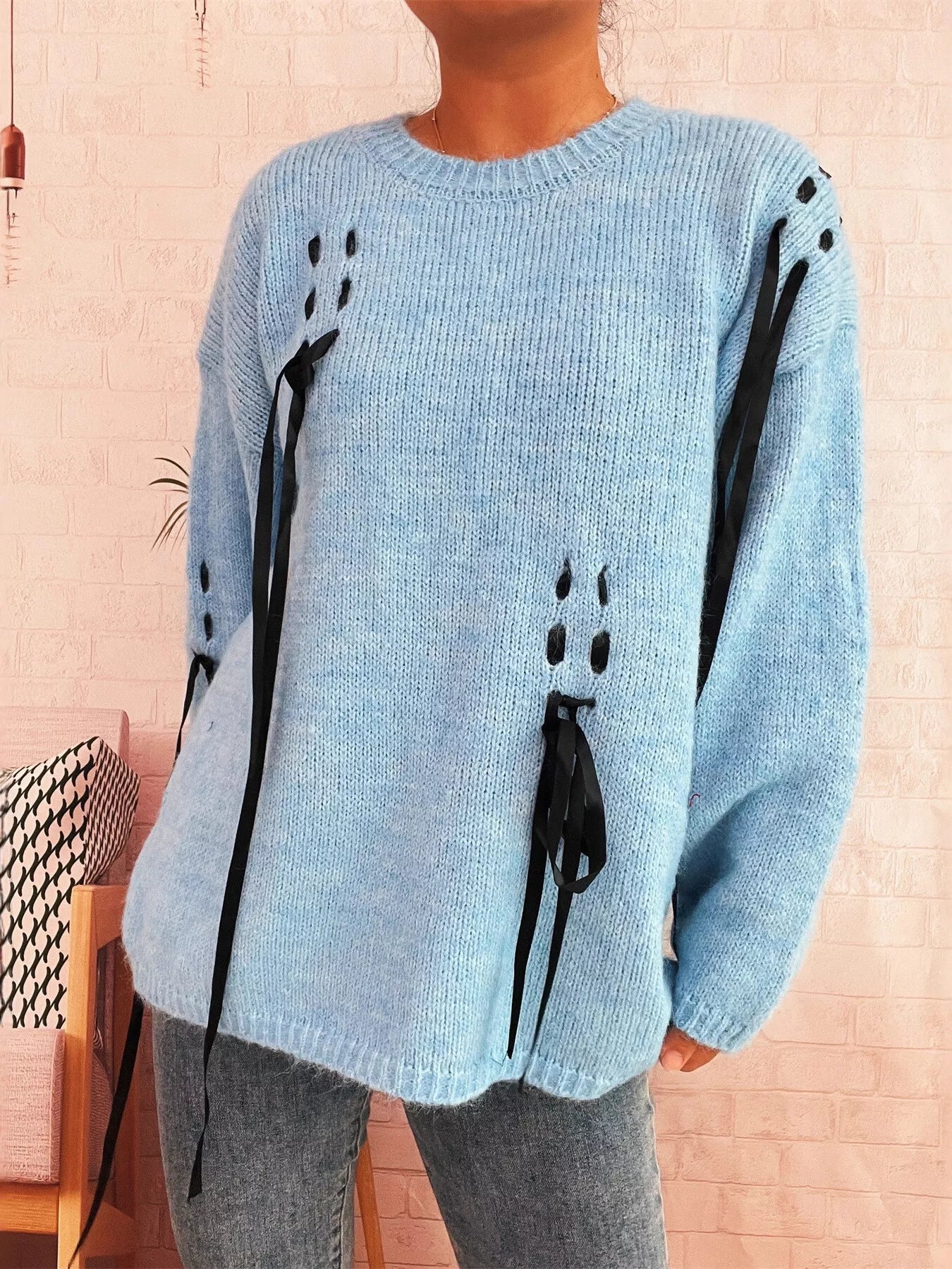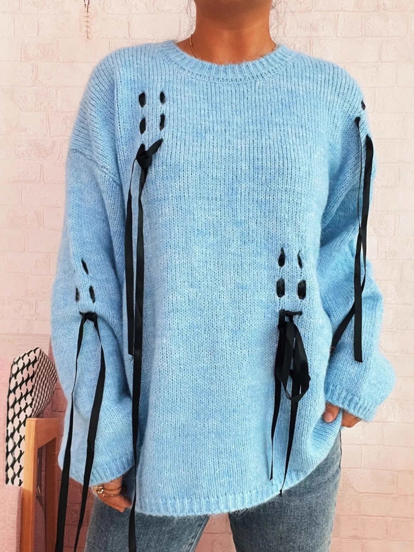 Round Neck Long Sleeve Sweater with Ribbon Details
